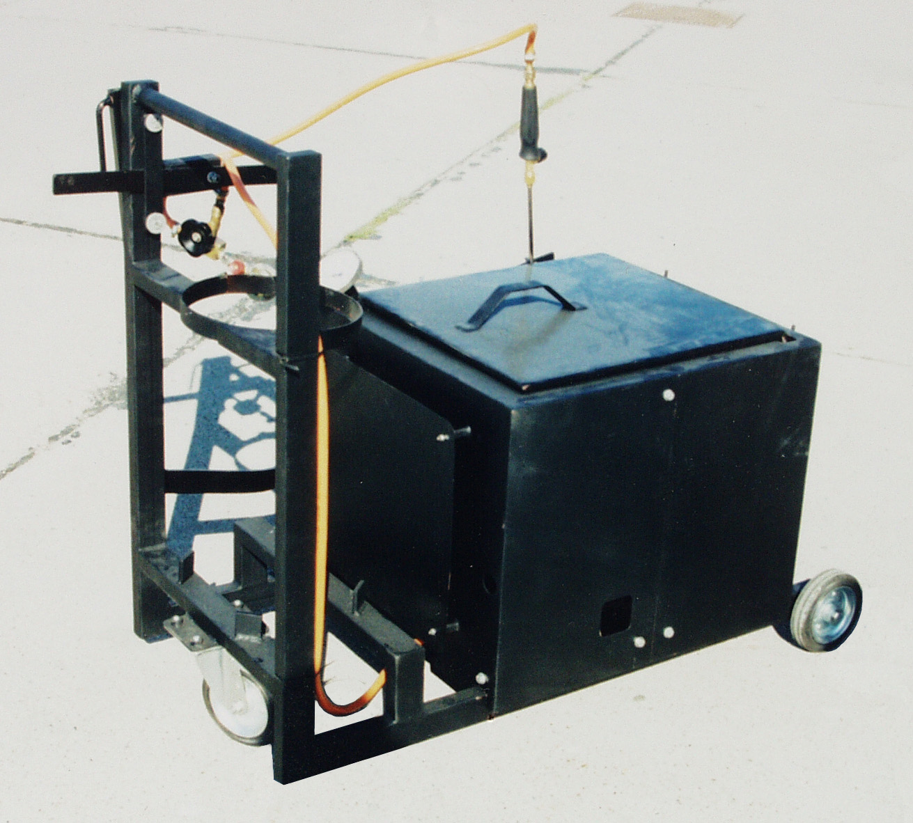 | Der 60 liter PB geheitzte Behälter ist ausgerüstet mit solchen Gußrahmen, welchen ermöglichen Nacharbeitfreien gießen des Risses mit dem etwa 320 °C warmen Termoplast. |