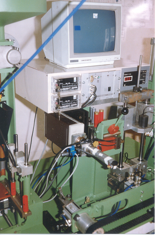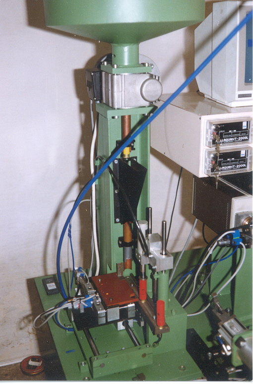 funktionsfähig ist.(Foto links 3. Pos) Am Foto rechts ist der 4. Prüf-Position, wo die Festigkeit des Armatur wird geprüft. Diese Prüfung simuliert den Schuss mit einen bestimmten Schlagkraft, welchen die Hülse ohne ständige Deformierung durchhalten muss. Der schwarze Spezial-Greifer hängt an einer Waagezelle, und haltet der Kunststoff-Mantel der Hülse. Der Hülsenkopf liegt im passenden Sitz im Schlagbrücke. Hinter dem Haupt-Träger befindet sich der Schlagzylinder, womit man den Schlagkraft erzeugt Den einstellbaren Schlagkraft wurde in jedem Zyklus Ausgschreibt, die Prüfergebnisse werden zur Datenspeicher geschickt Am Ende der Prüfprozess ein Pressluft-Impuls ausblast die Hülse vom Greifer |