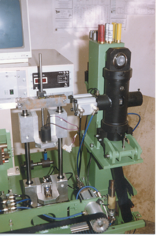 Das Prüfziel ist zerstörende Prüfung von 12, 16 und 20 Kaliber Jagdmunition-Hülsen Diese Gerät prüft Längsmassen, Form, Betriebsfähigkeit und Festigkeit den halbfertigen Musterteilen in 4 Prüf-Positionen mit automatischen Material-Transport Am obern linken Teil der Prüfzelle befindet sich der Behälter in deeren die prüfende Stücke einladen muss.(1. Pos) Es ist hinter der Bedienfleche des Gerätes. An der Mitte der Prüfzelle sieht man der Bildschirm des Form-Kontroll-System, (2. Pos) mit dem Bild des Hülsenkonturs Unten liegt der Tastatur womit man die Prüfungsdaten eingeben kann zum Messdaten-Sammler. In 3. Position wurde die Betriebsfähigkeit des Anzünders geprüft mit bestimmten Kraft In dem 4. Position wird gemacht ein festigkeit Prüfung |